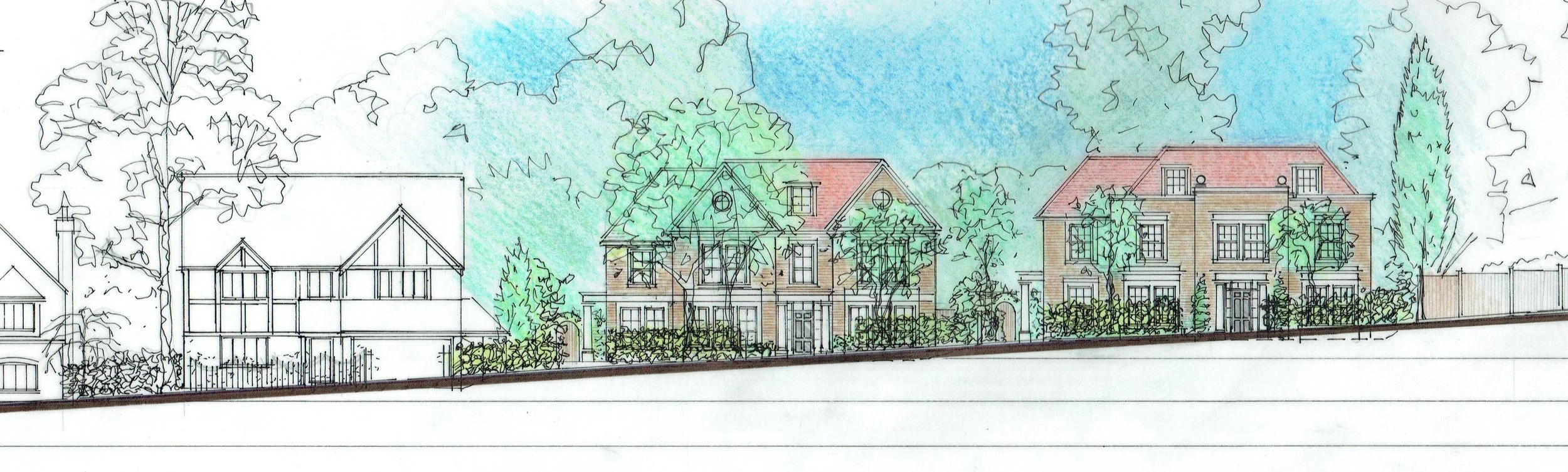 Four large houses on a sensitive site overlooking a Conservation Area. By articulating the front elevation in major and minor elements a centerline is created through the front door of one of each pair of houses, instead of through a party wall. This helps create the impression of a single large detached house and preserves the character of the immediate area. We considered this was particularly relevant given the planning history of consent for just two detached houses.